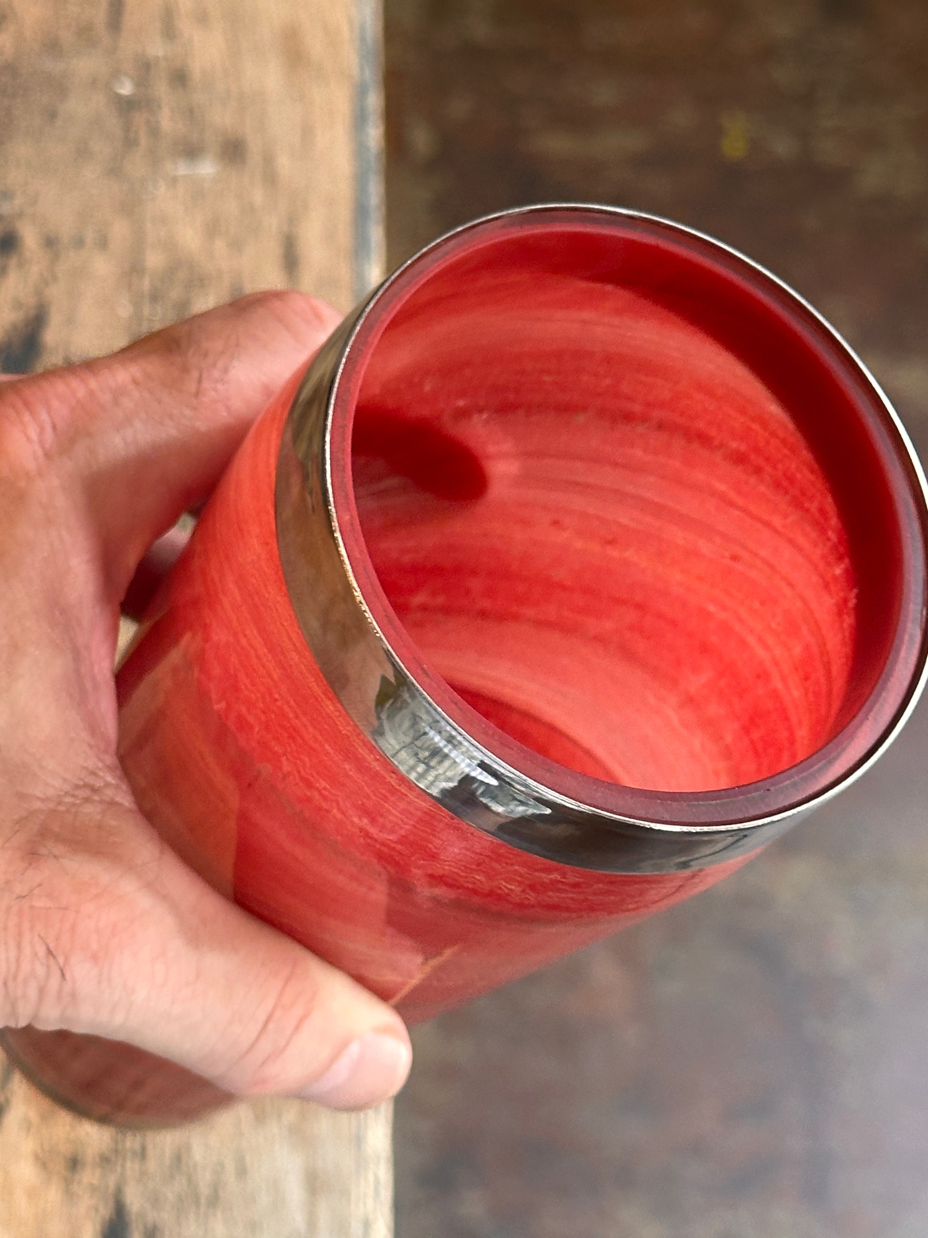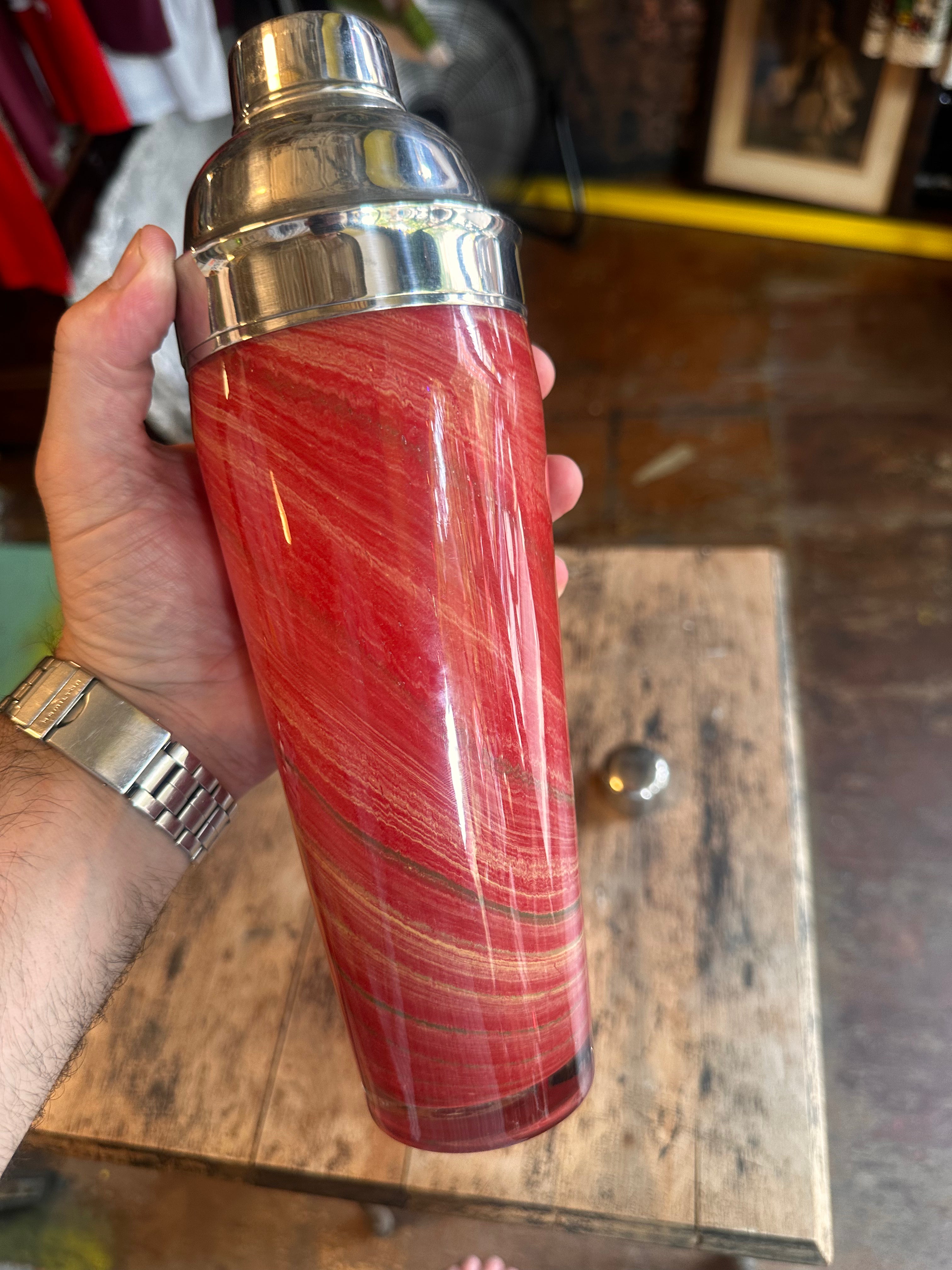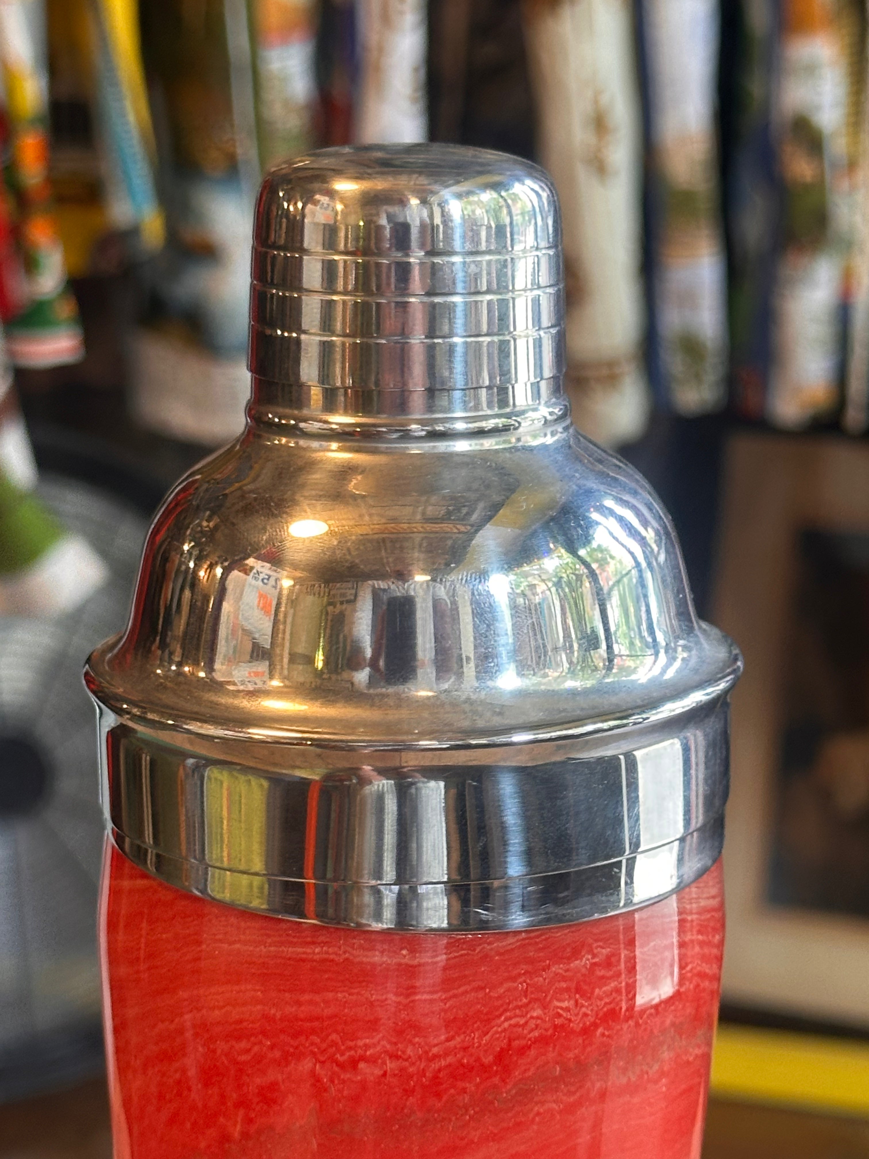 Kinda swirled painted style, chrome topped MCM vintage cocktail shaker. Rare.