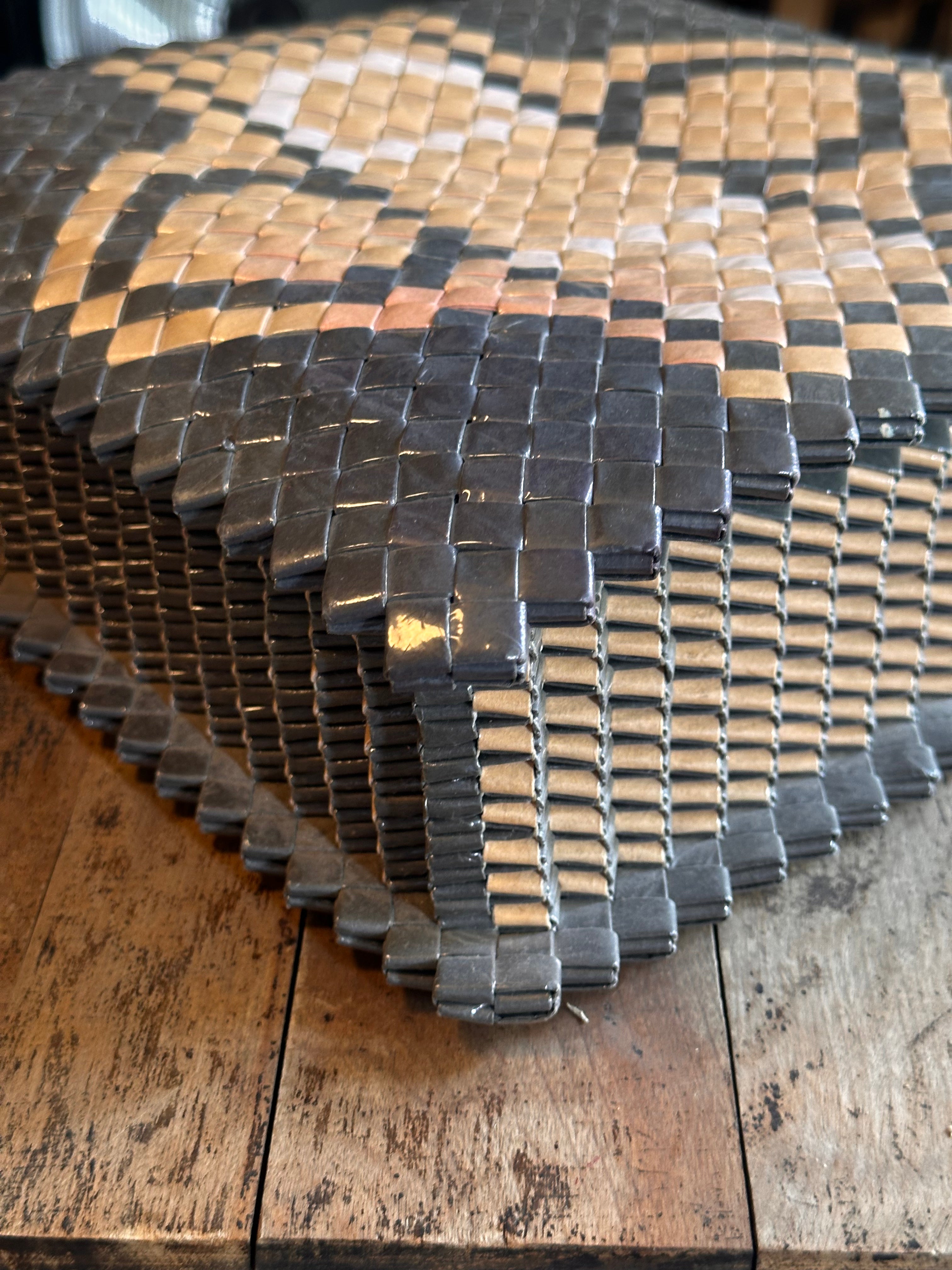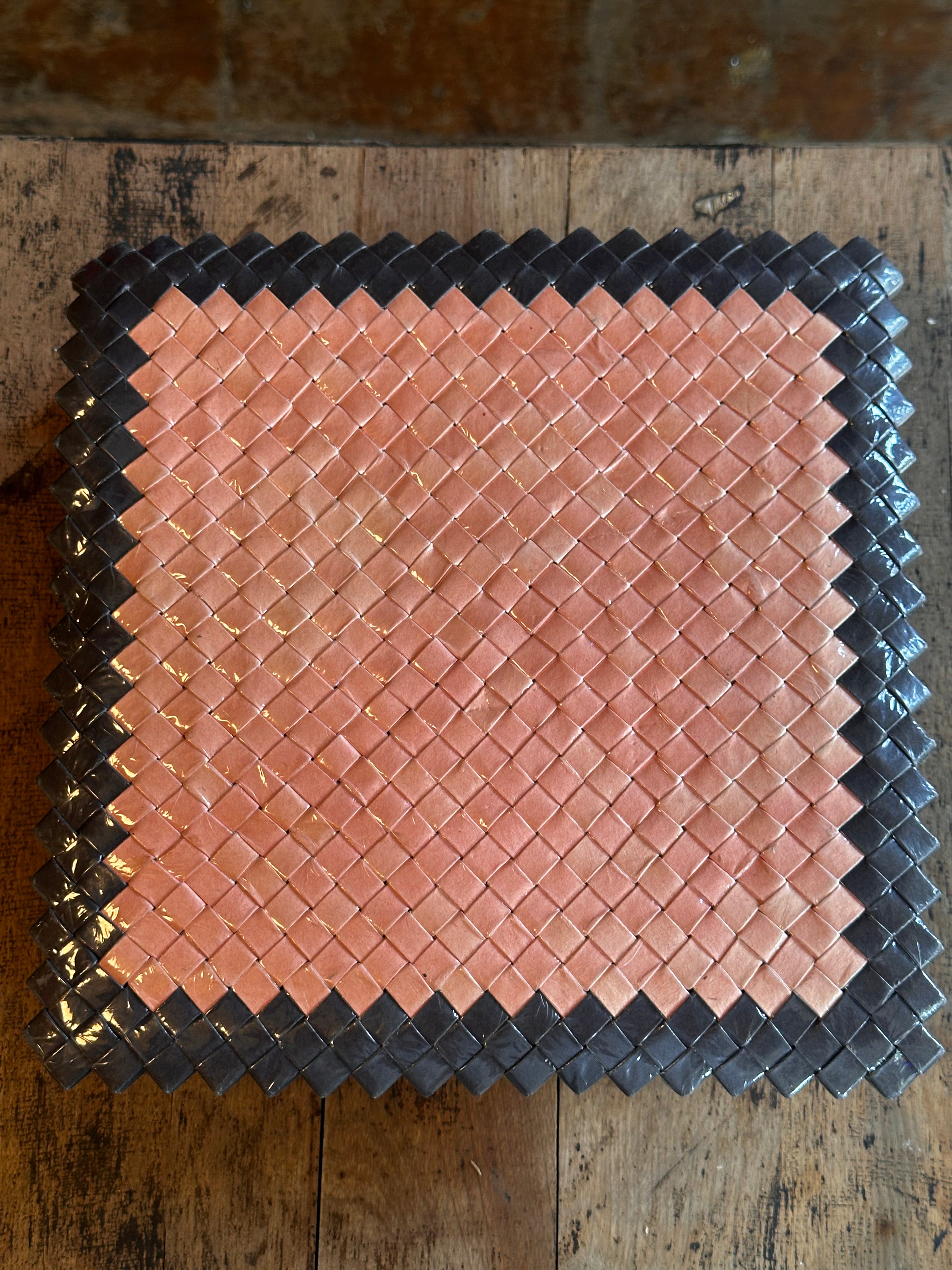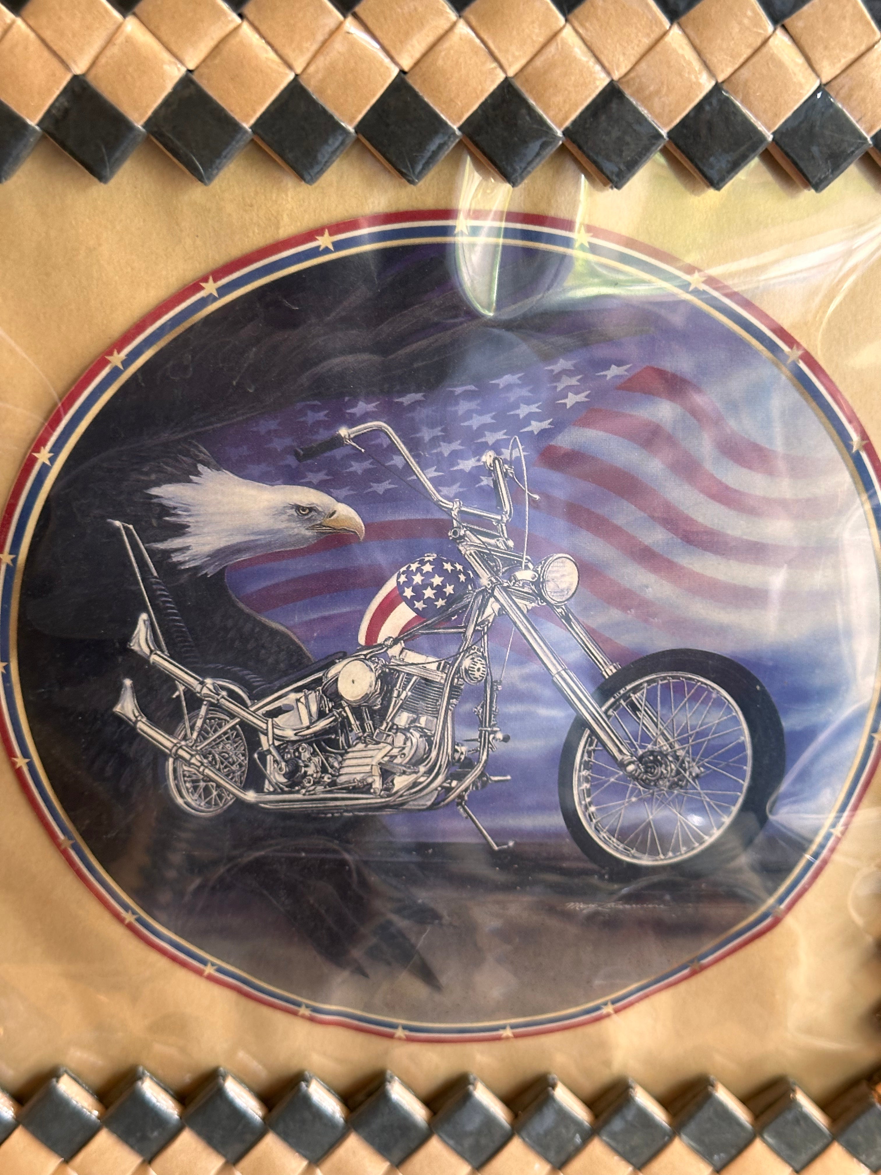 LOVE this piece. Bought from a Salt Lake City Pawn shop in 2012. This is a amazing piece of American folk art. Done in what I call the Prison Art style which is a weaving with whats available. This is a jewelry box with the letters HD for Harley Davidson on the front in contrasting color. A print of a Harley has been slid into the top.