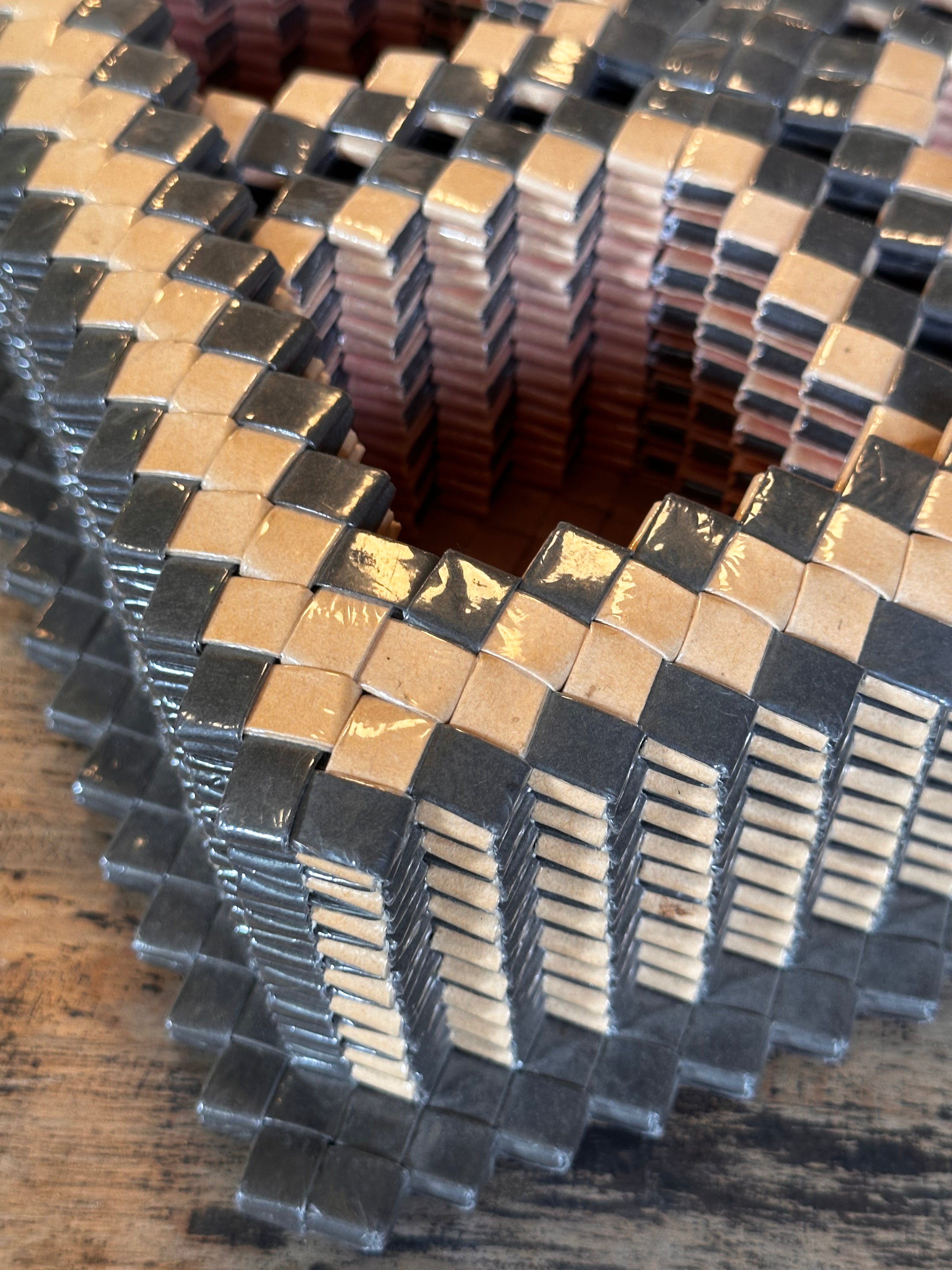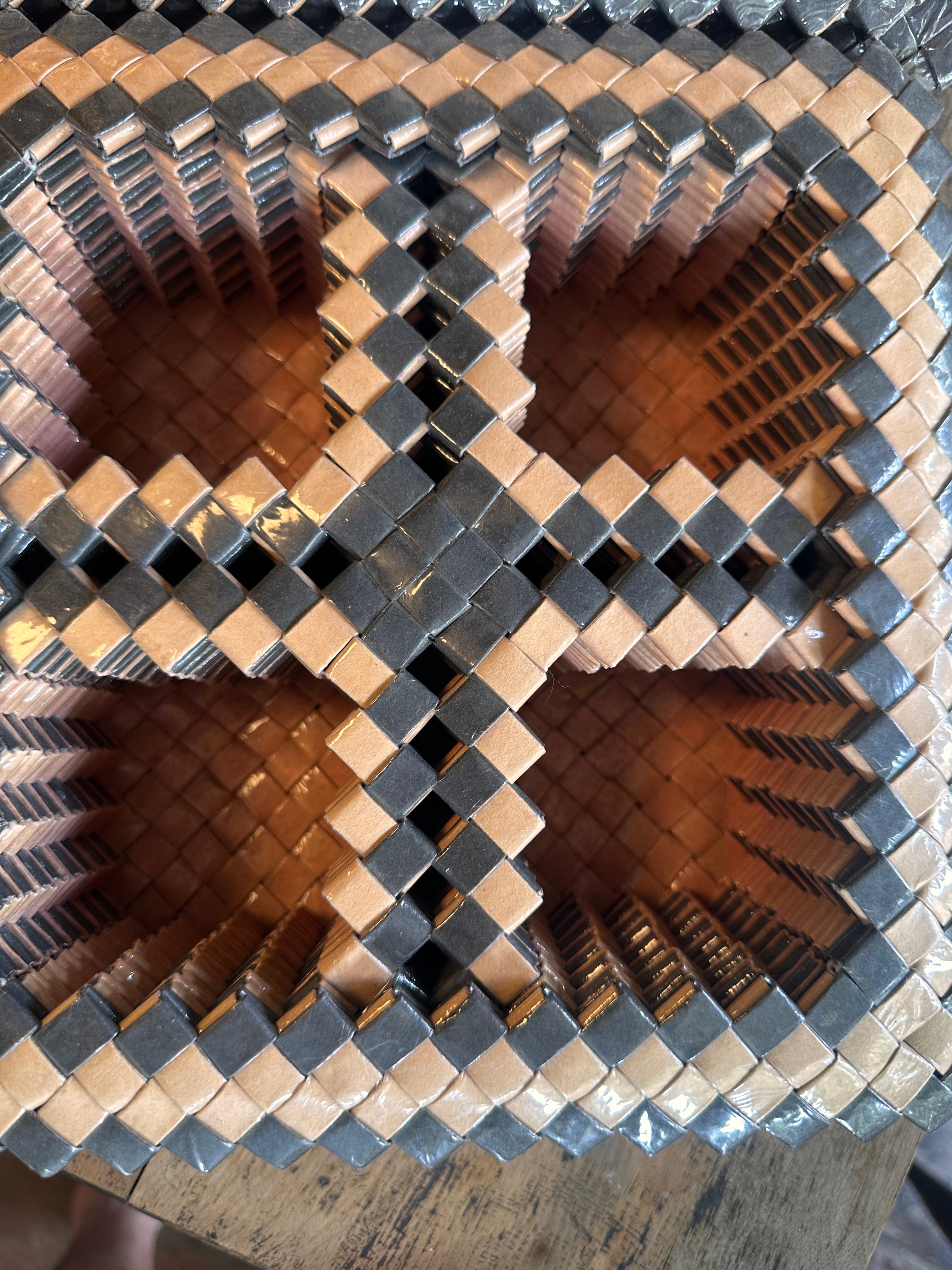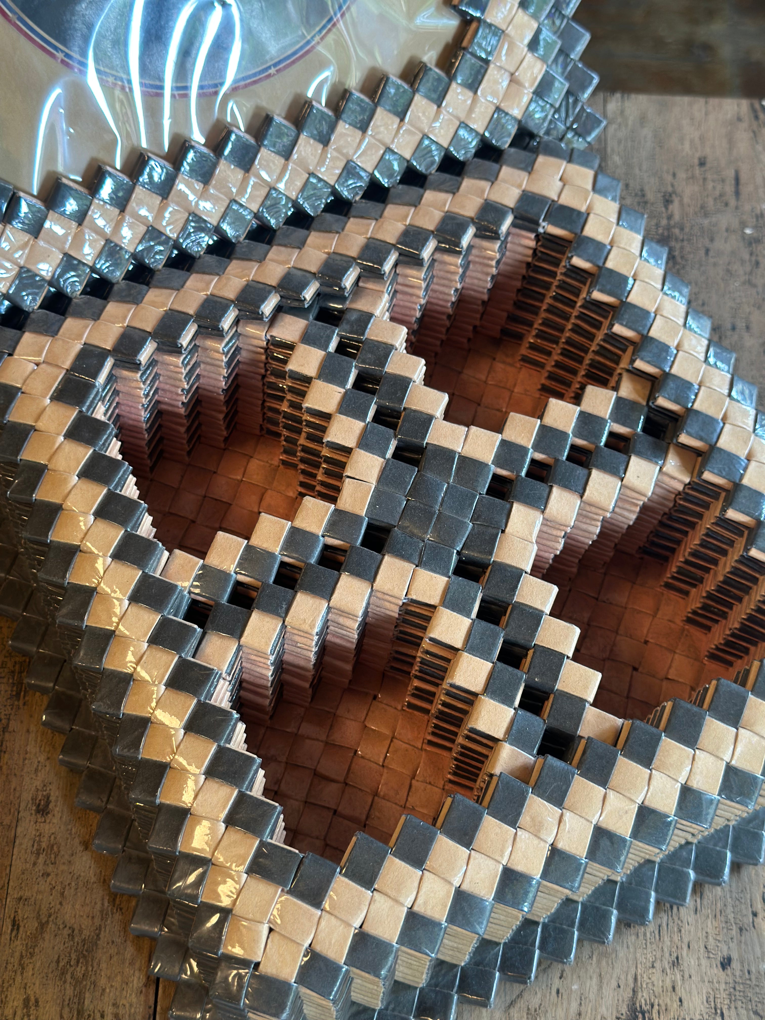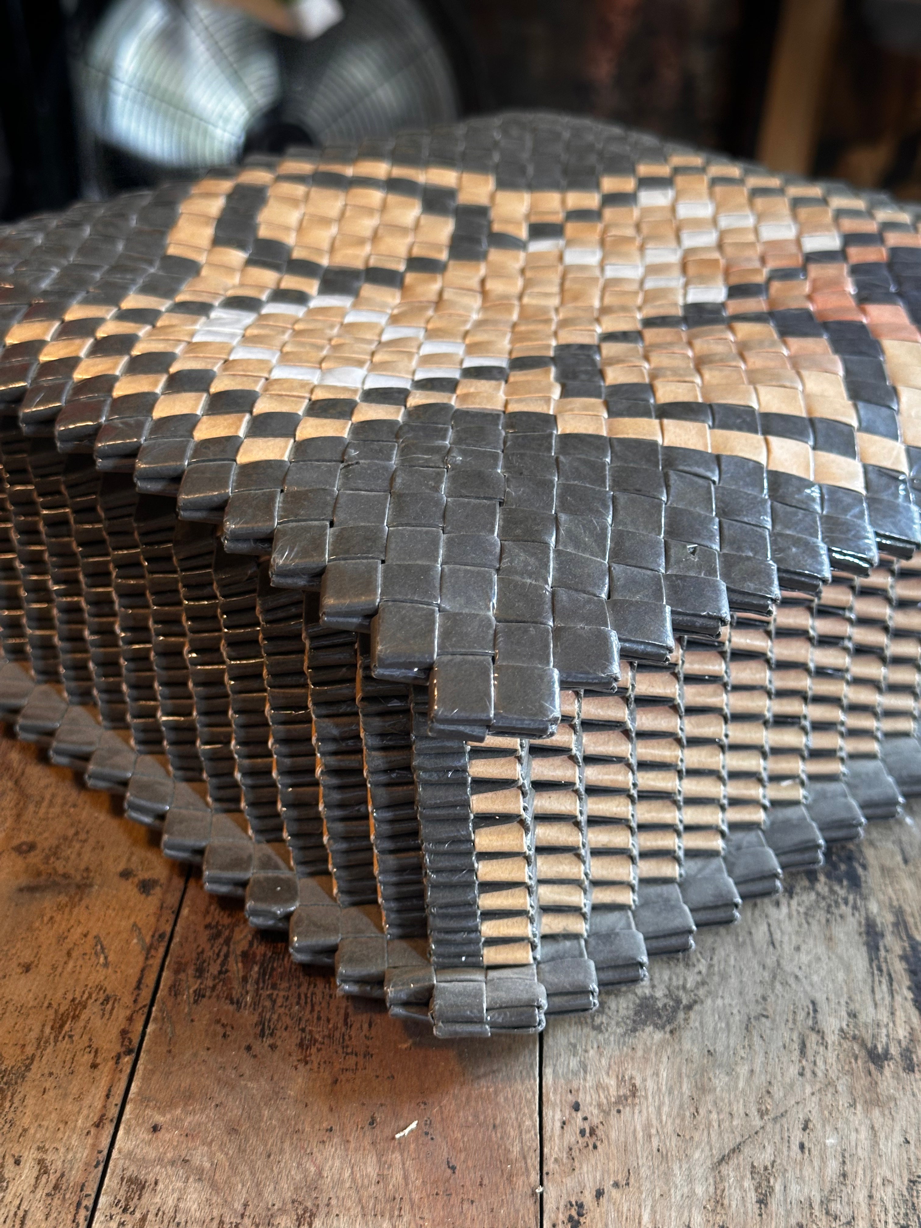 LOVE this piece. Bought from a Salt Lake City Pawn shop in 2012. This is a amazing piece of American folk art. Done in what I call the Prison Art style which is a weaving with whats available. This is a jewelry box with the letters HD for Harley Davidson on the front in contrasting color. A print of a Harley has been slid into the top.