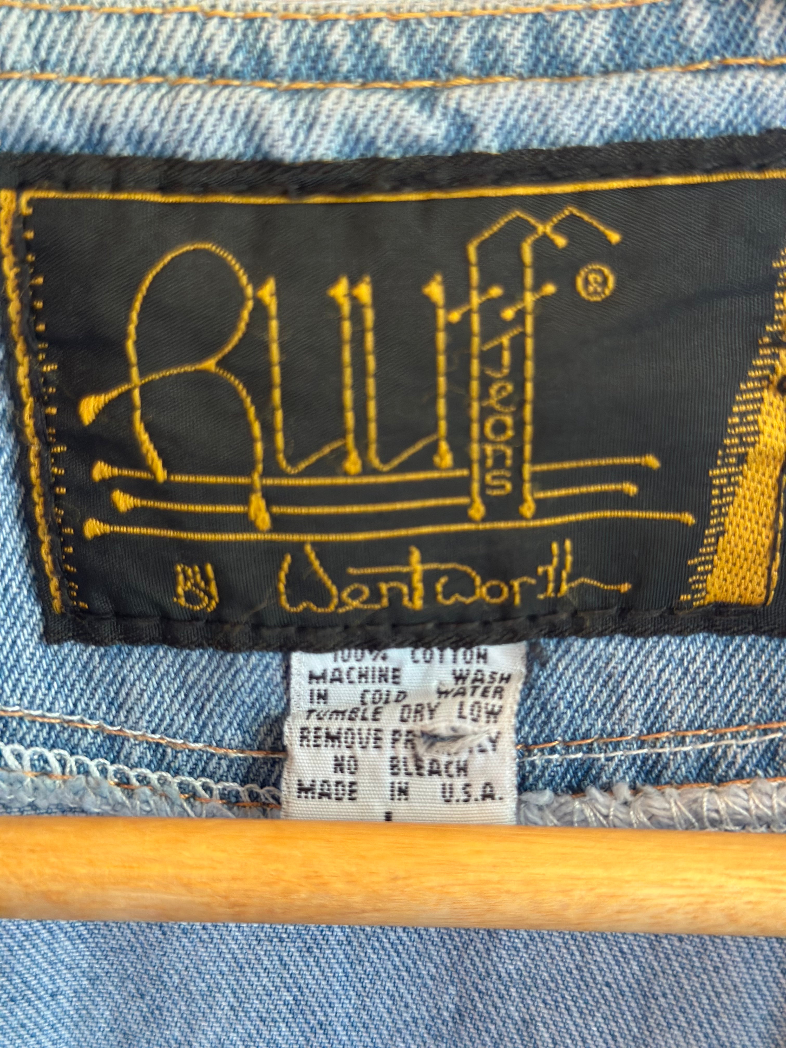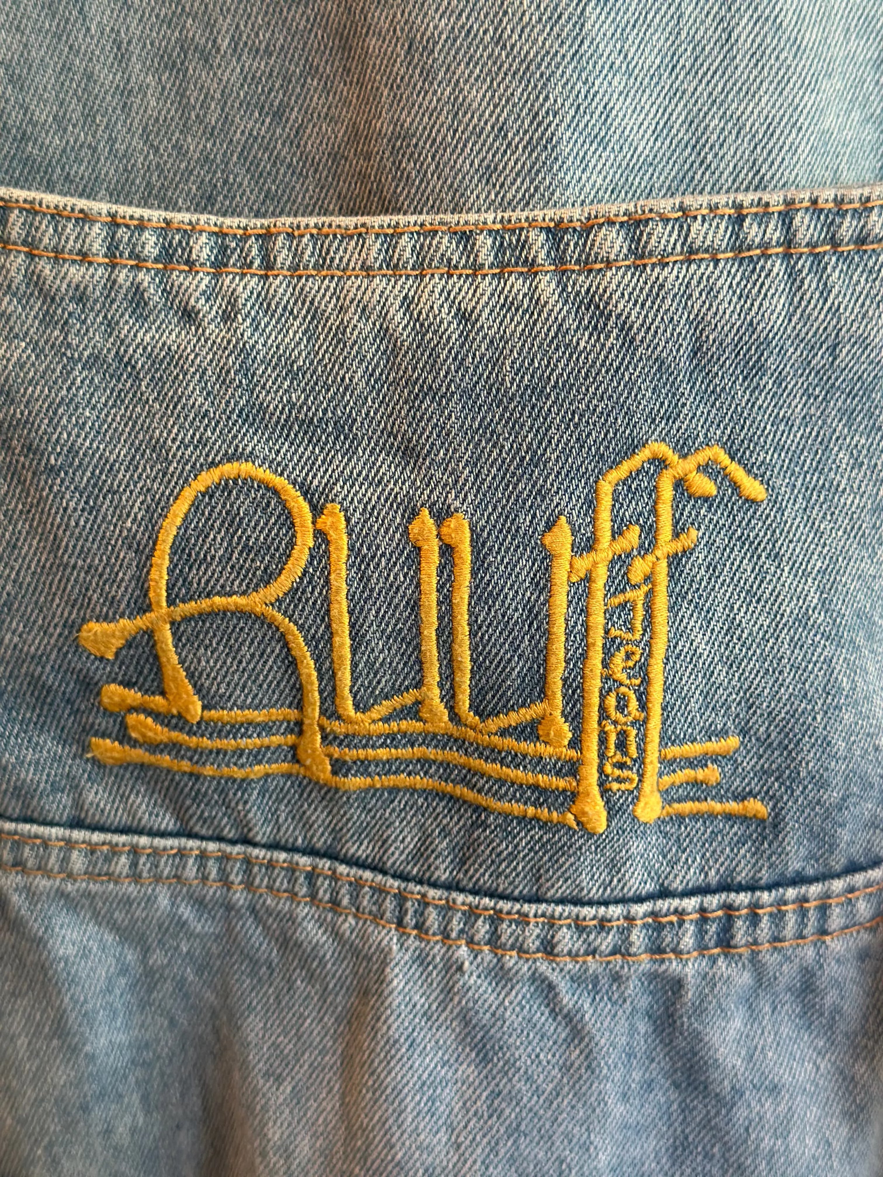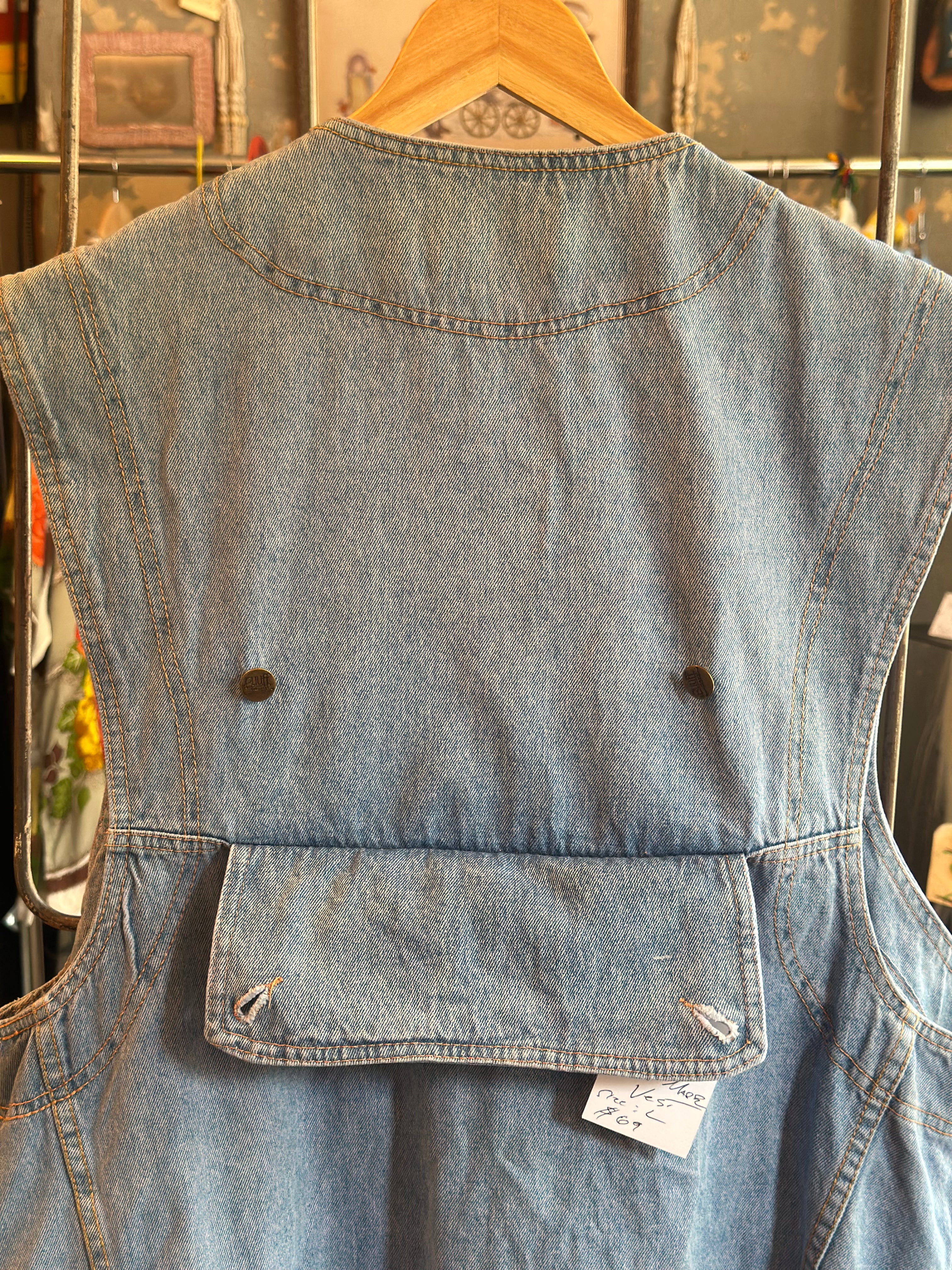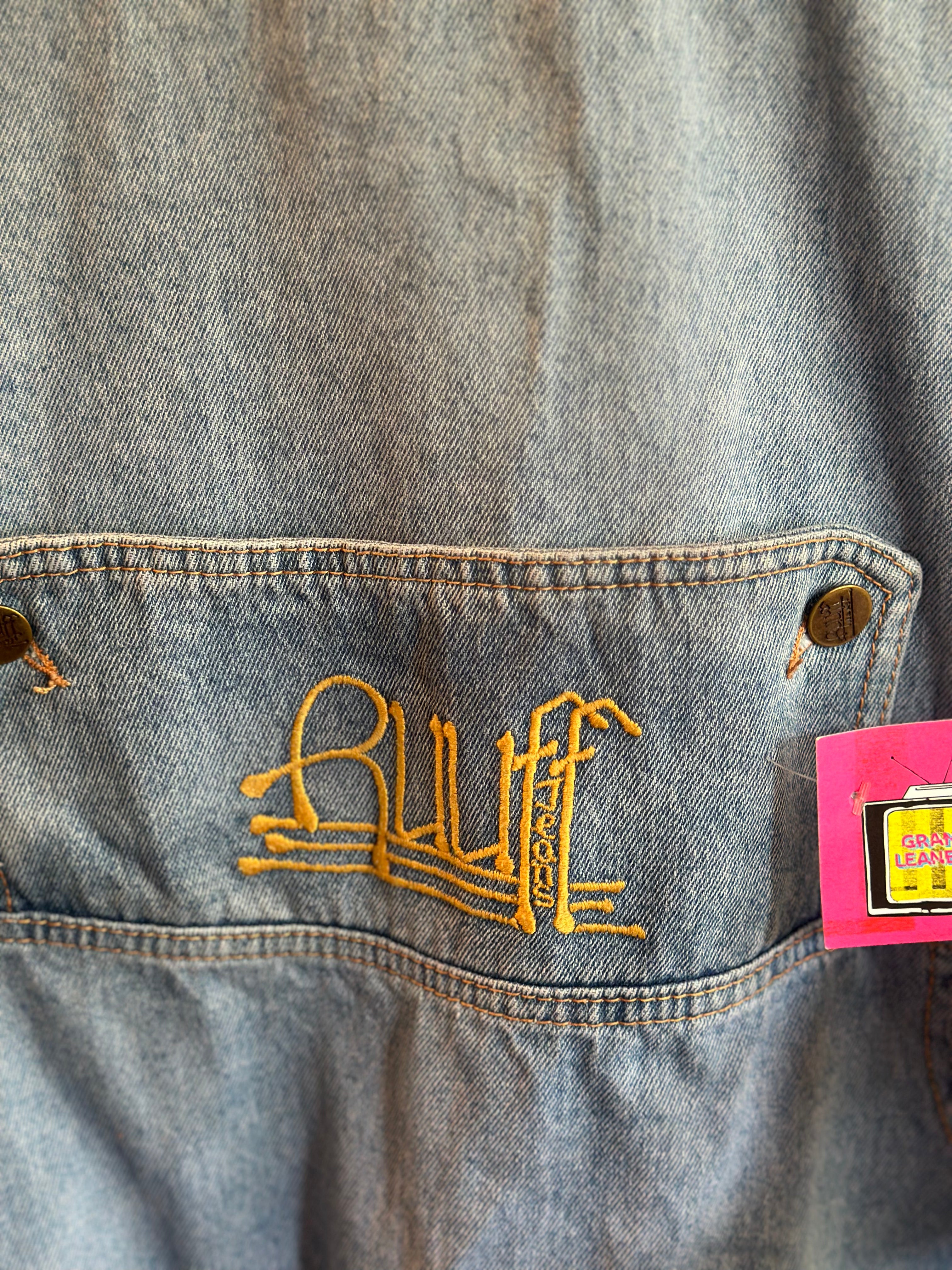 One my favorite pieces in the house. 1990’s hiphop style denim vest with pocket on back and embroidery. Brand is RUFF jeans by Wentworth. Size: Men's Large. Quite long. Ladies, wear as a dress.