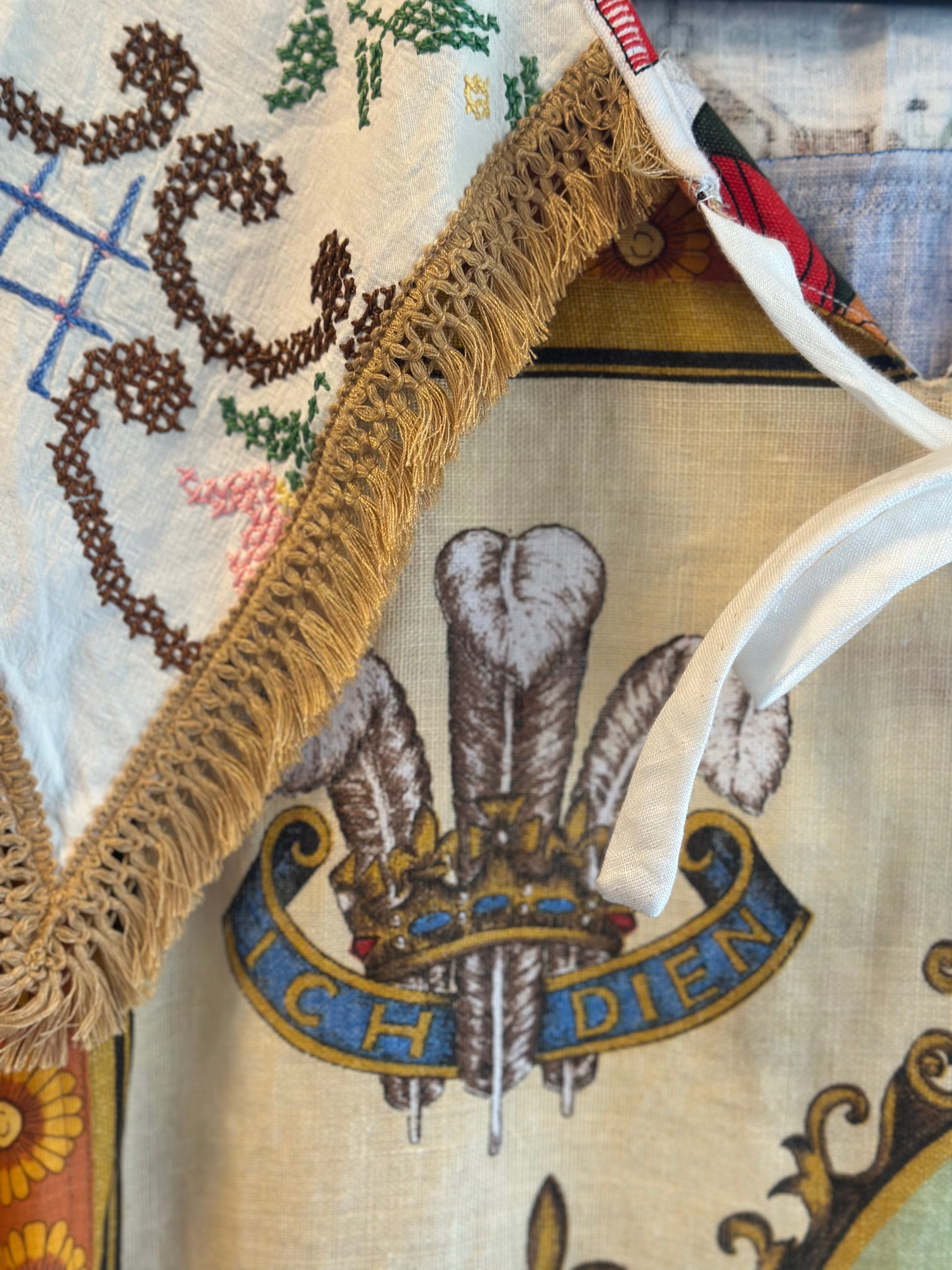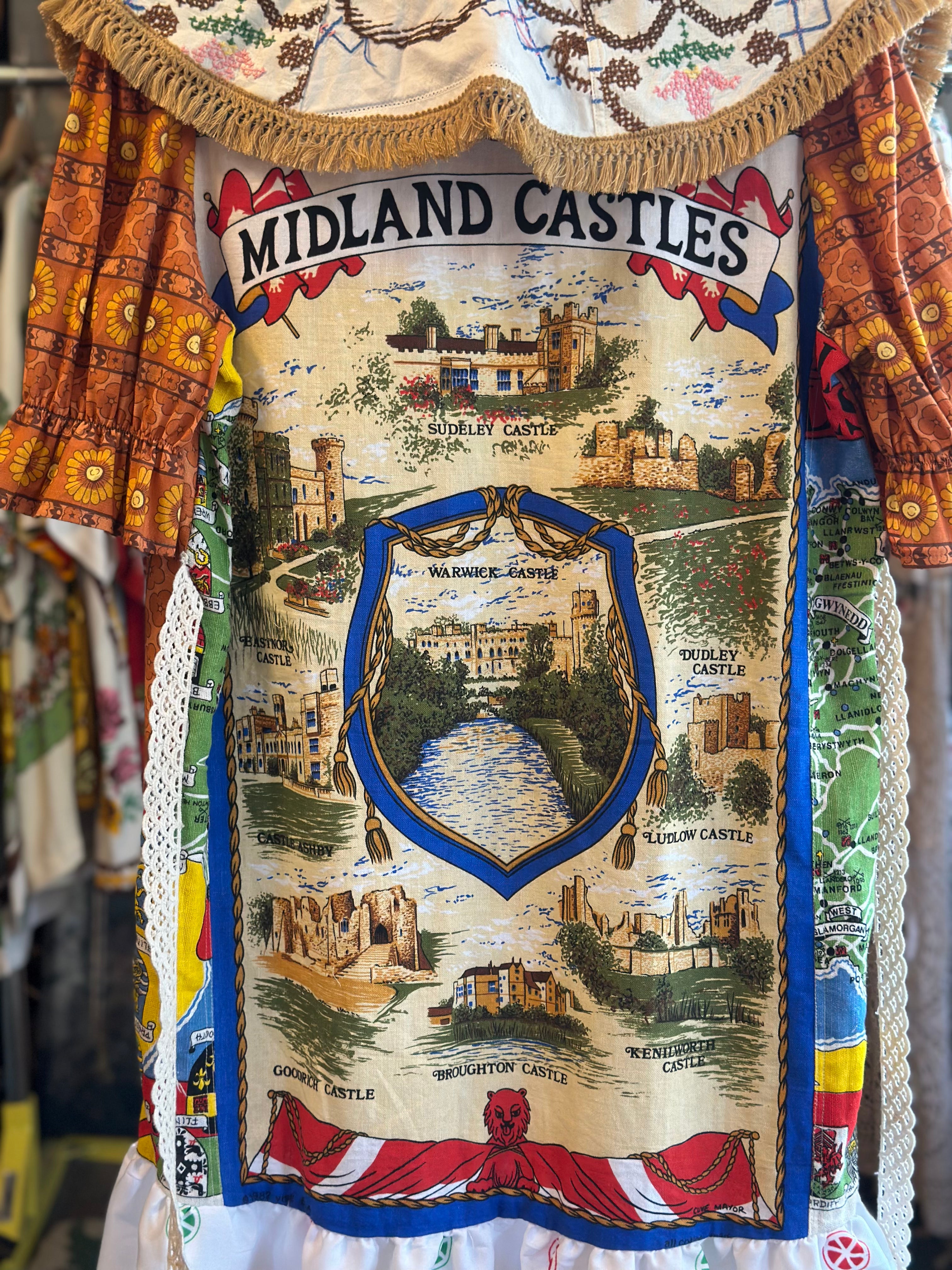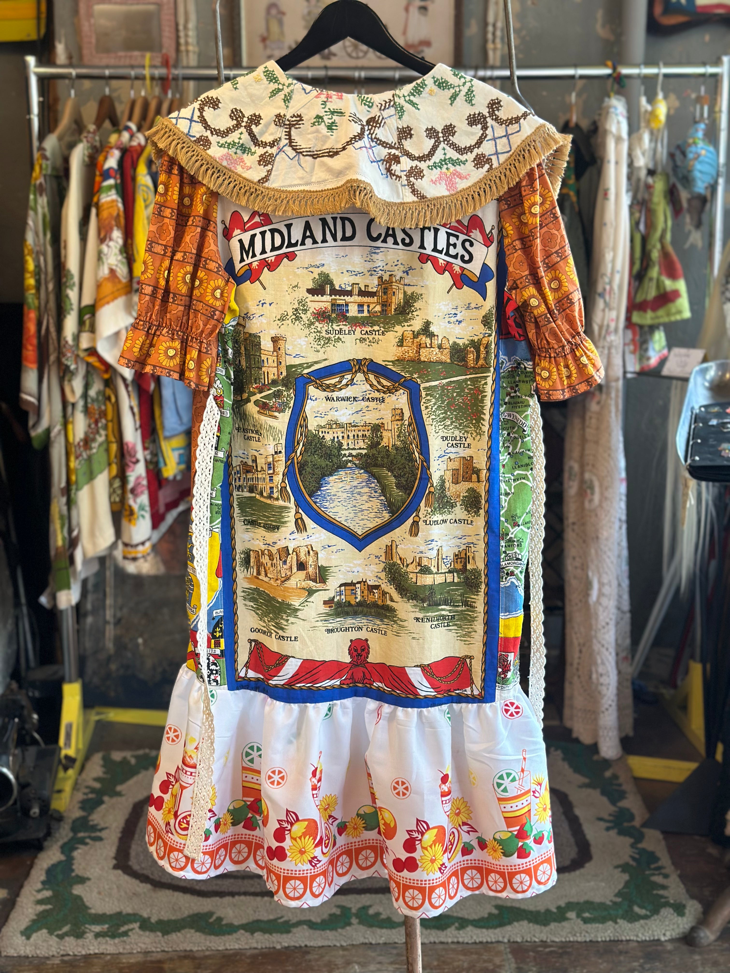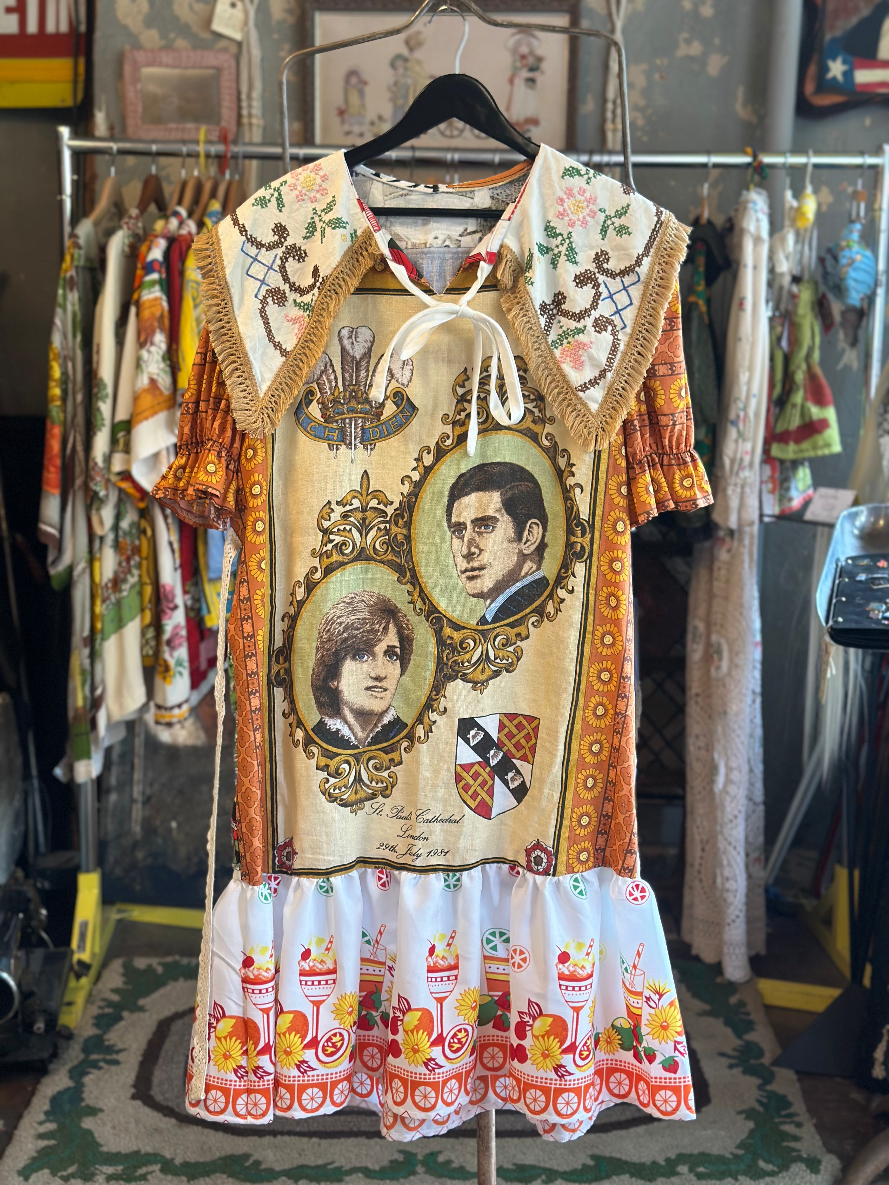 Hand made dress, upcycled with vintage linens. From Bangkok. One size. This unique piece uses a tea towel that commemorates the royal wedding of Prince Charles to Lady Diane in 1981. The back is constructed with a tea towel showcasing the Castles of Midland, England.