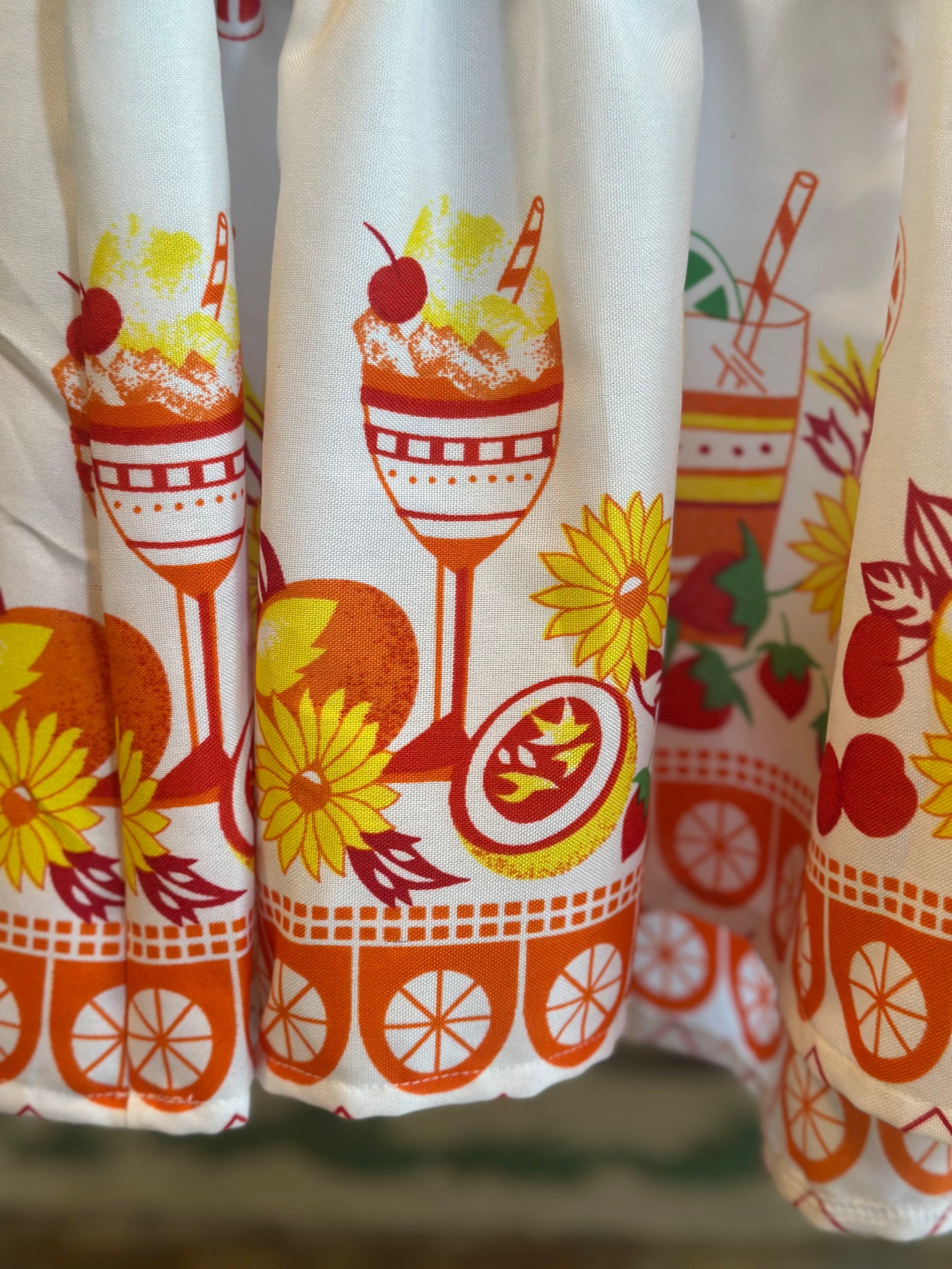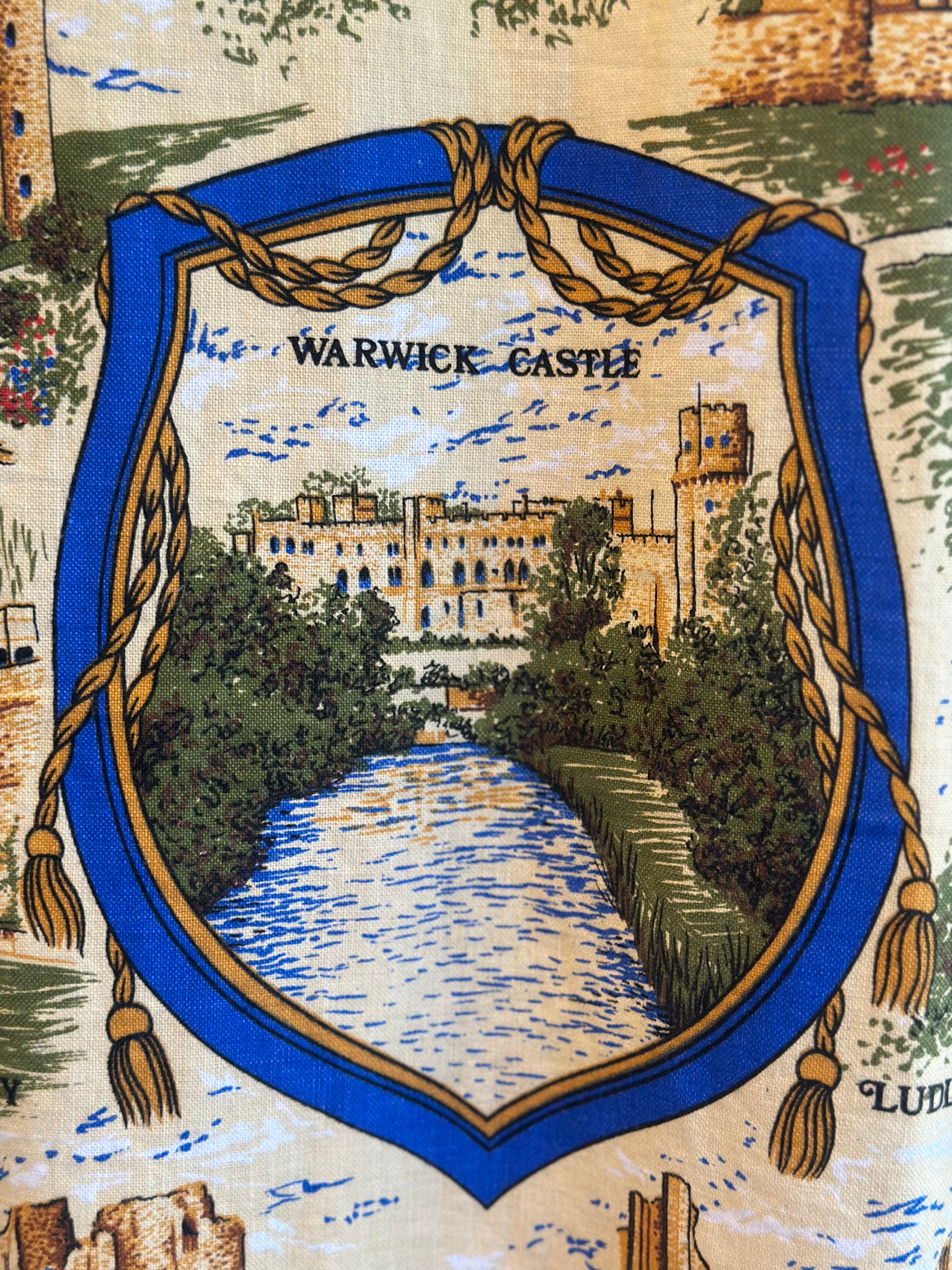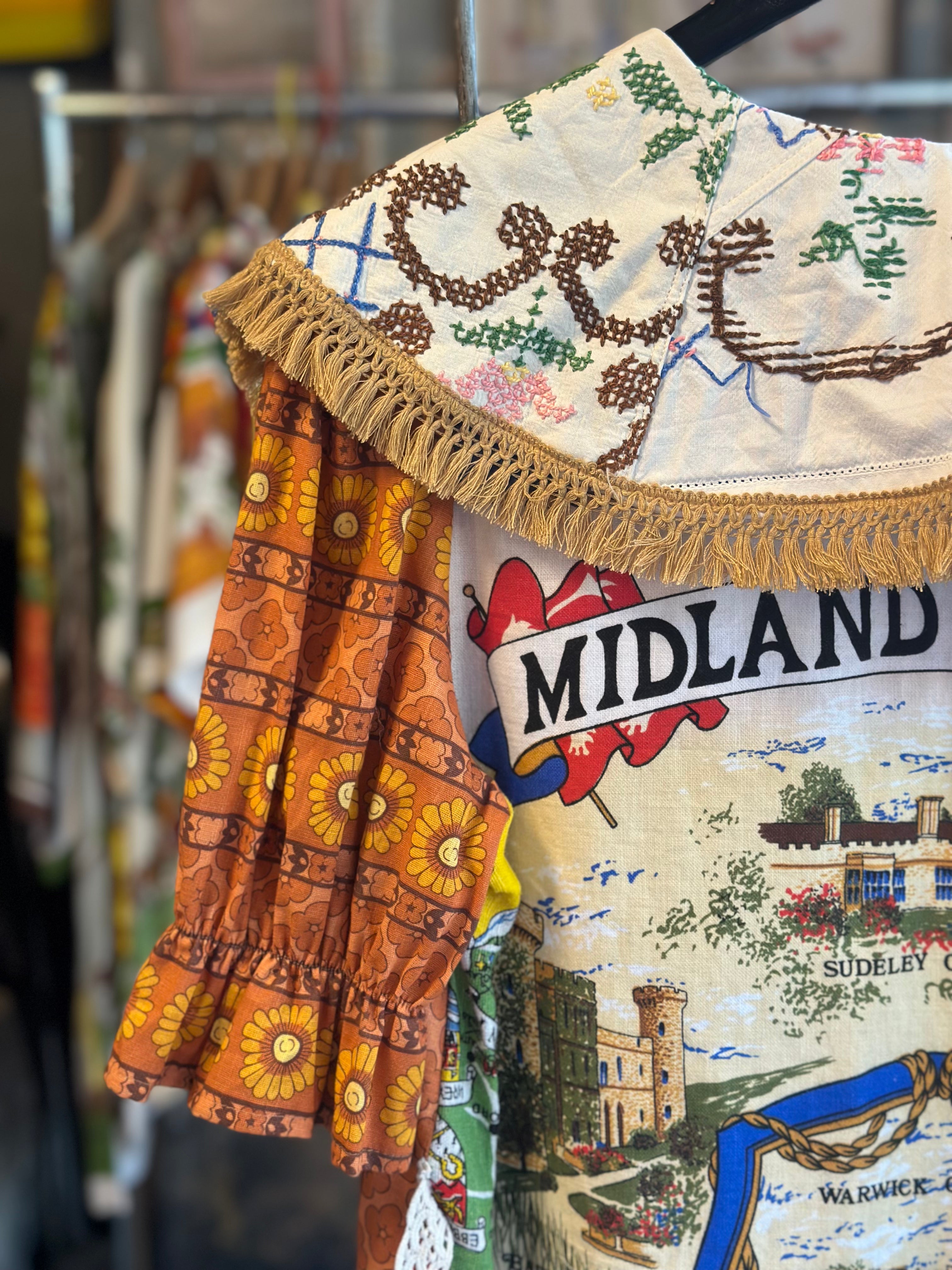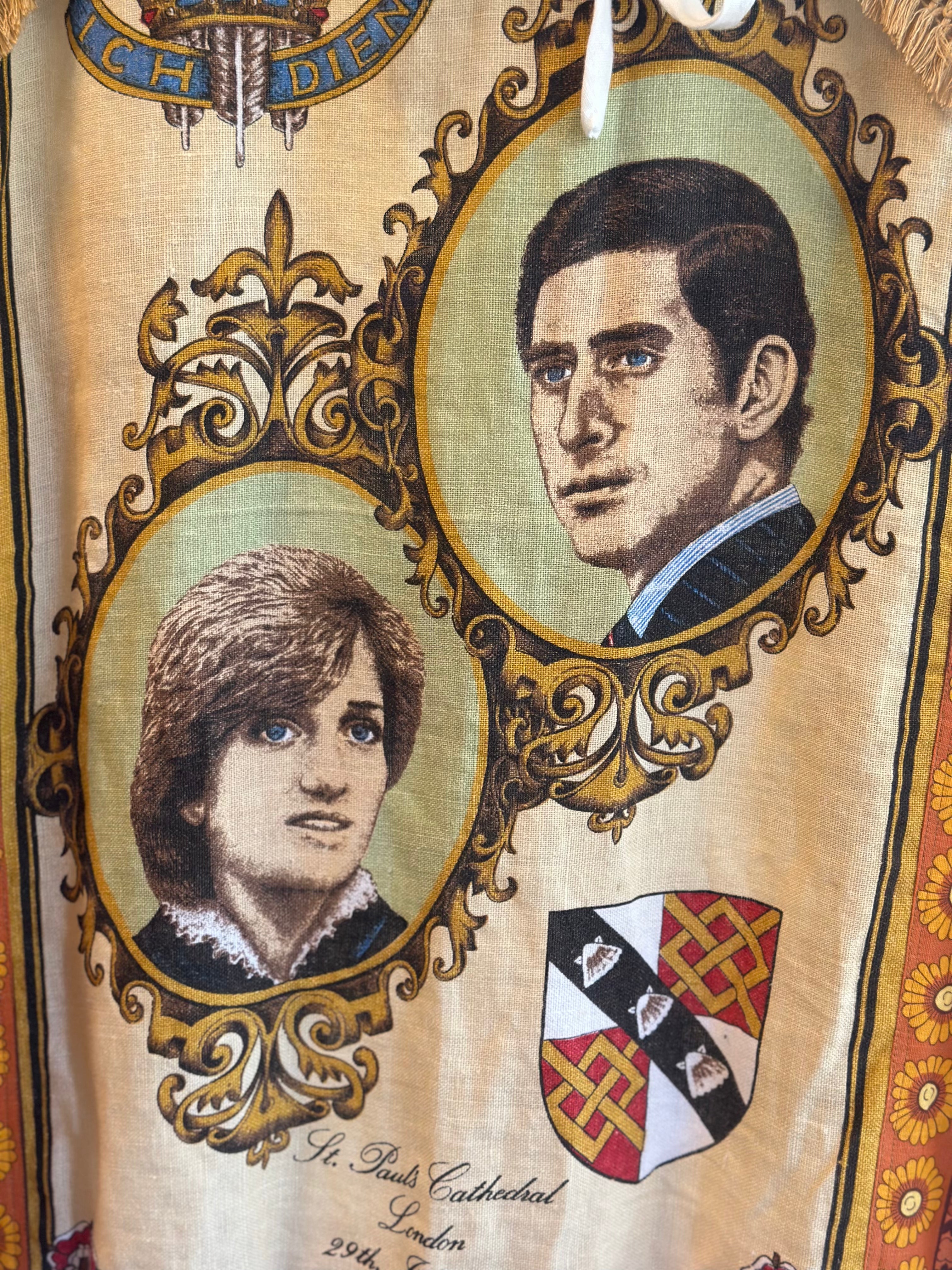 Hand made dress, upcycled with vintage linens. From Bangkok. One size. This unique piece uses a tea towel that commemorates the royal wedding of Prince Charles to Lady Diane in 1981. The back is constructed with a tea towel showcasing the Castles of Midland, England.