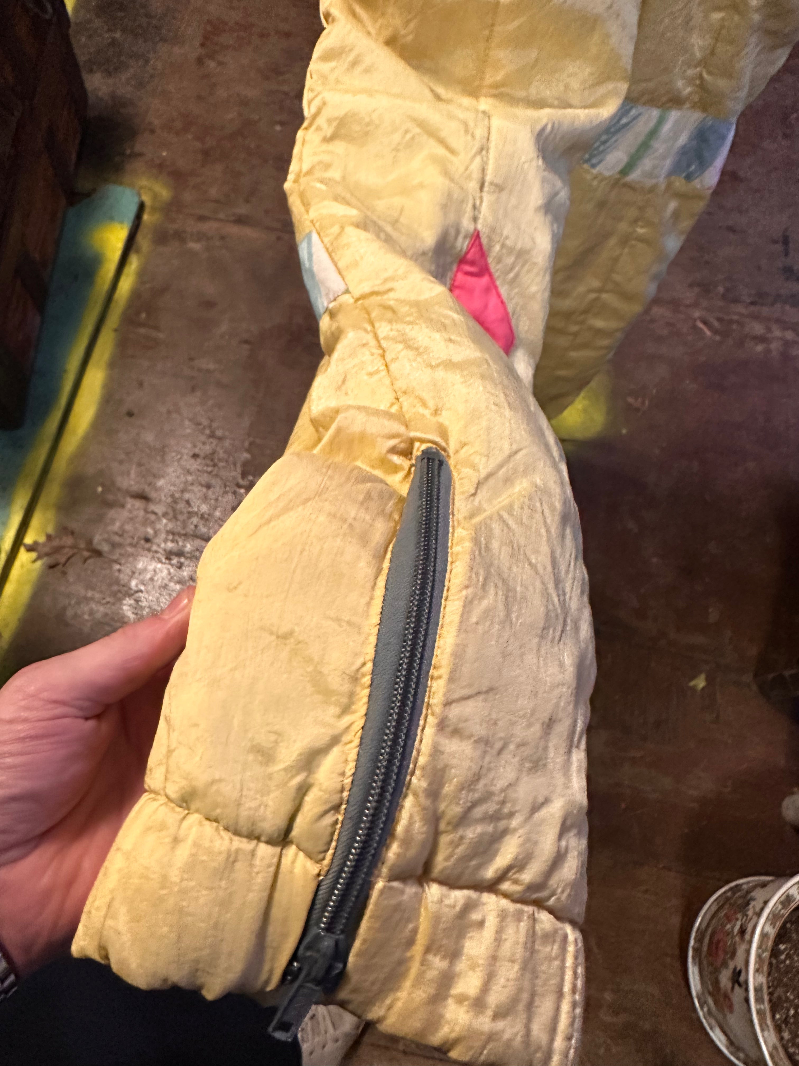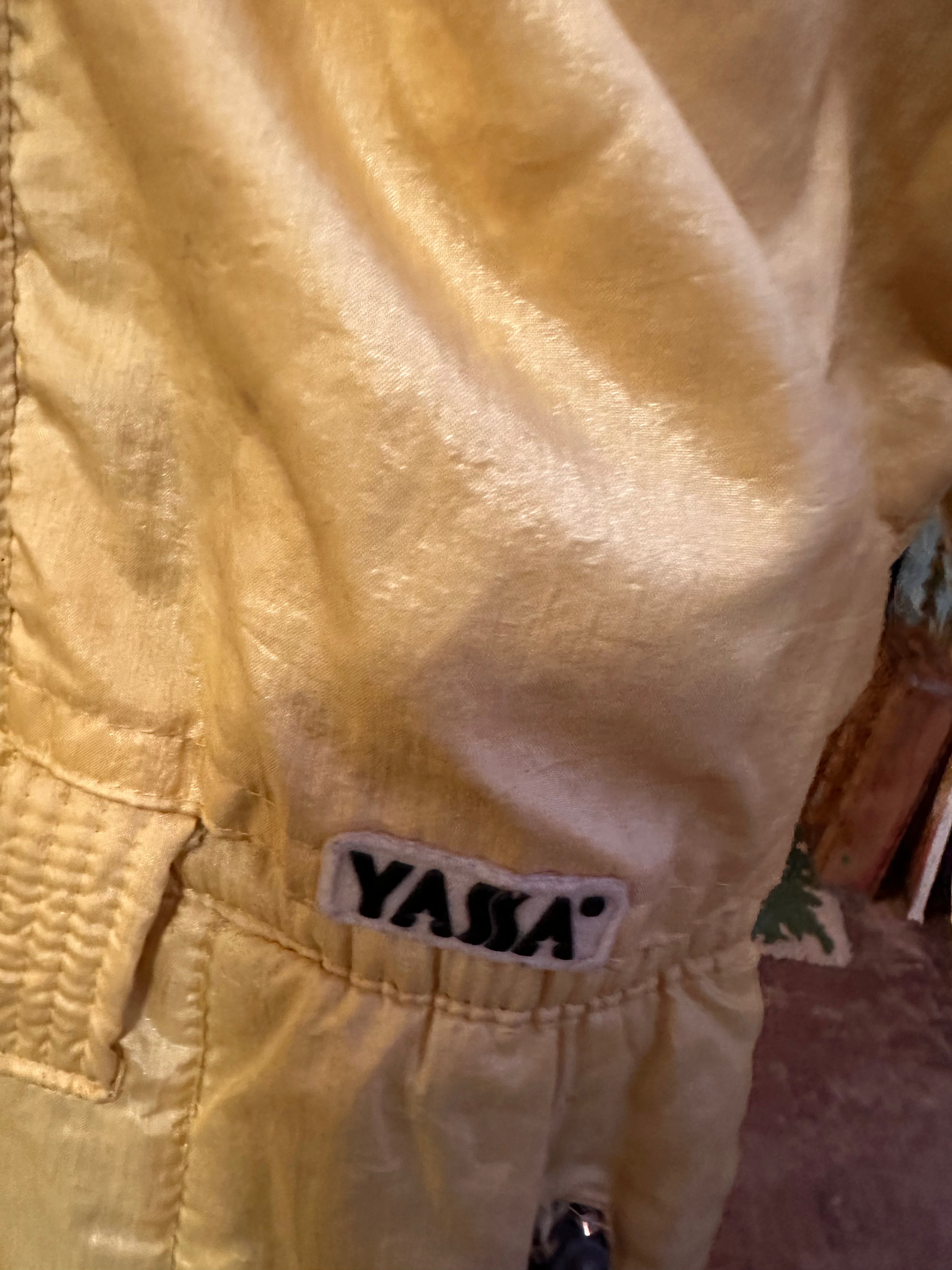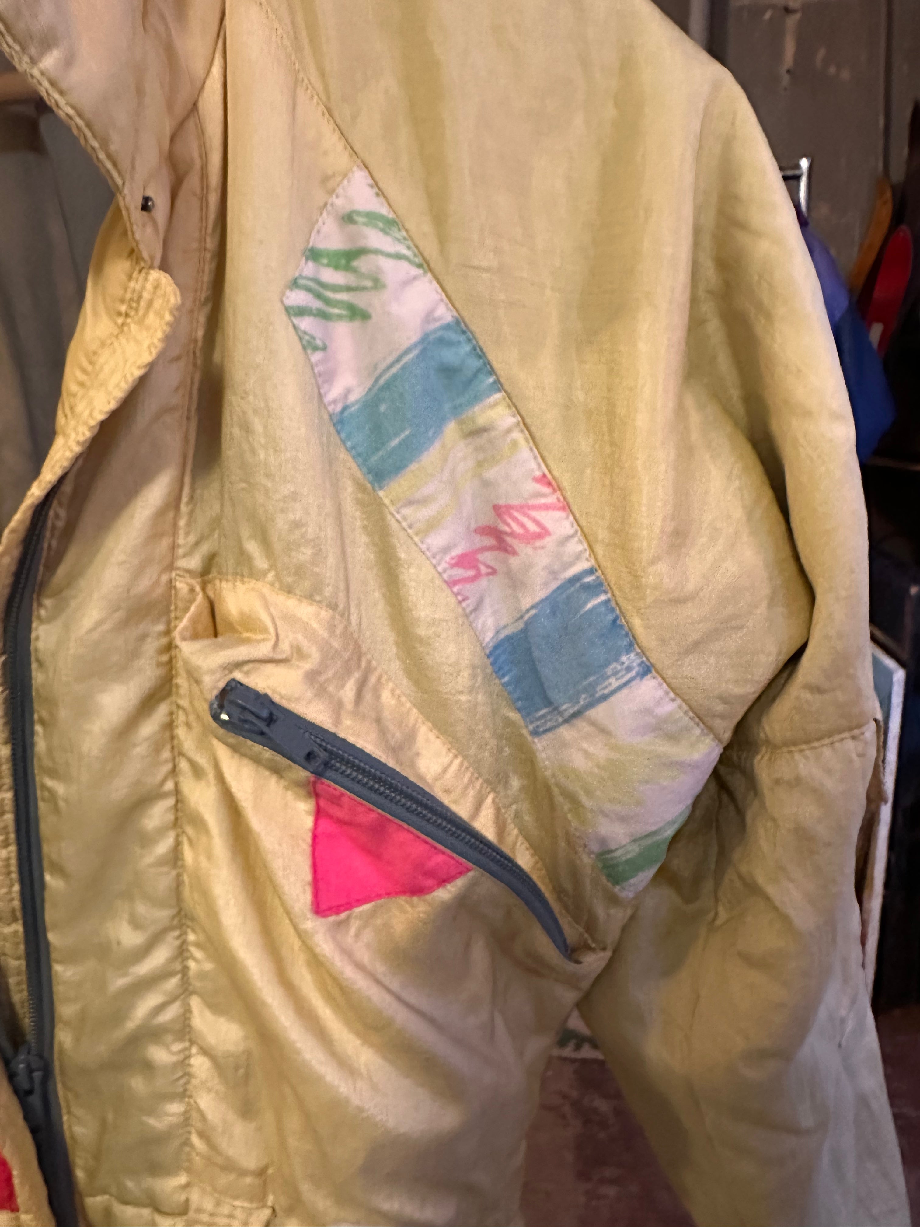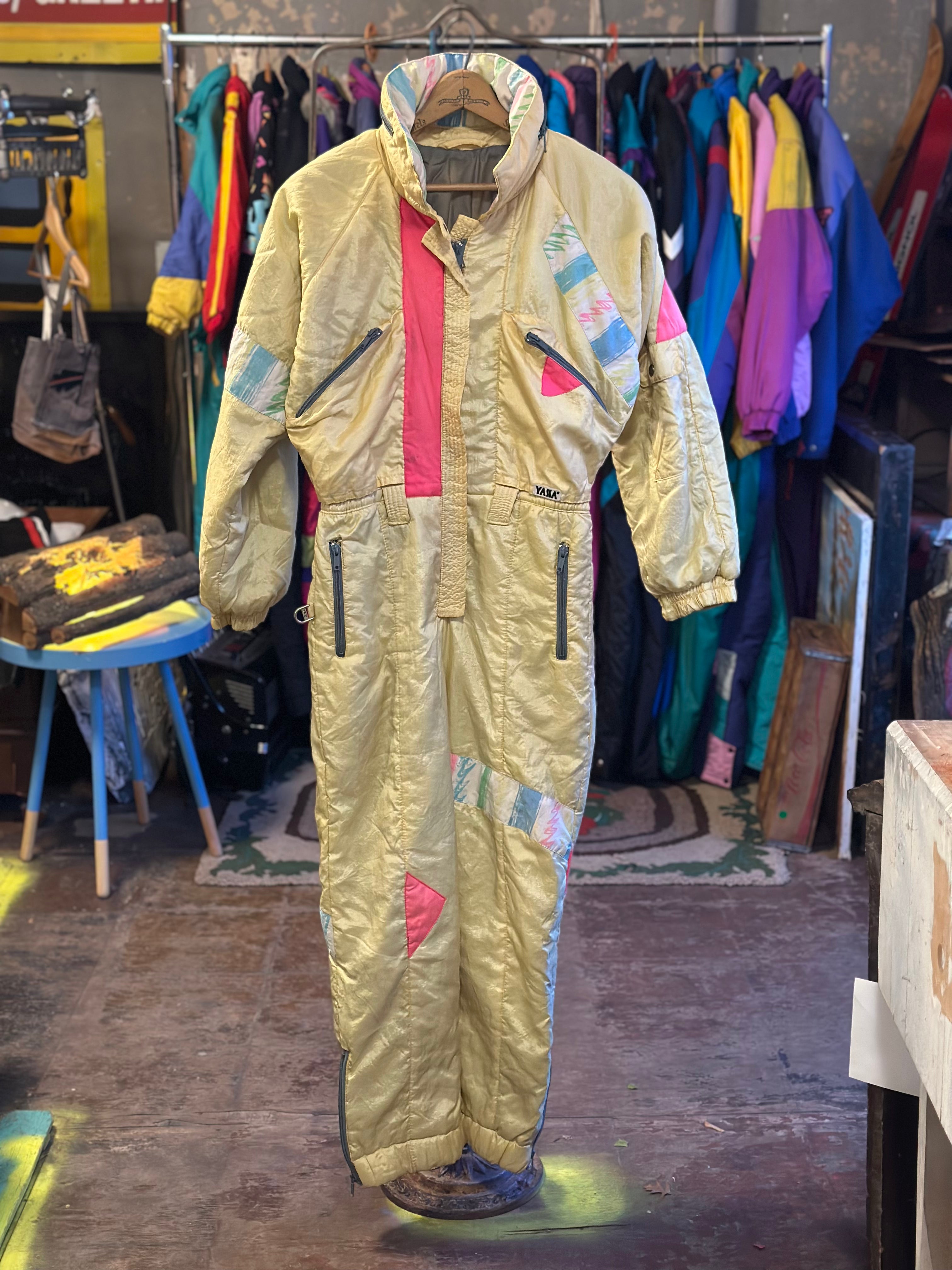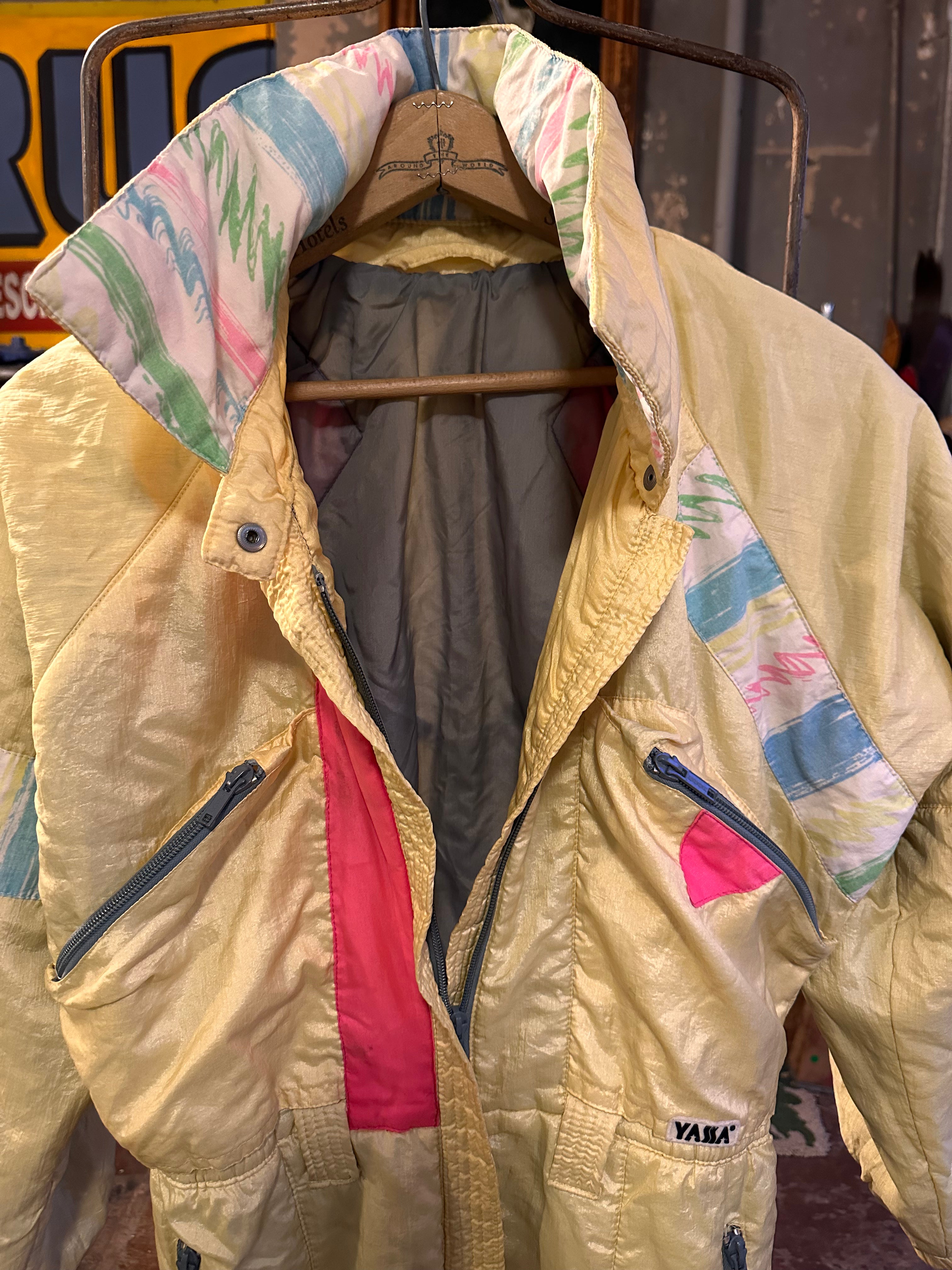 Vintage French stock butter yellow ski suit with neon pink and Barbie pastel Memphis print accents. From Konfekcija Varaždin, later known as YASSA. Made in the former Yugoslavia. Marked size 38, could be women's size 8. Today likely a women's S.